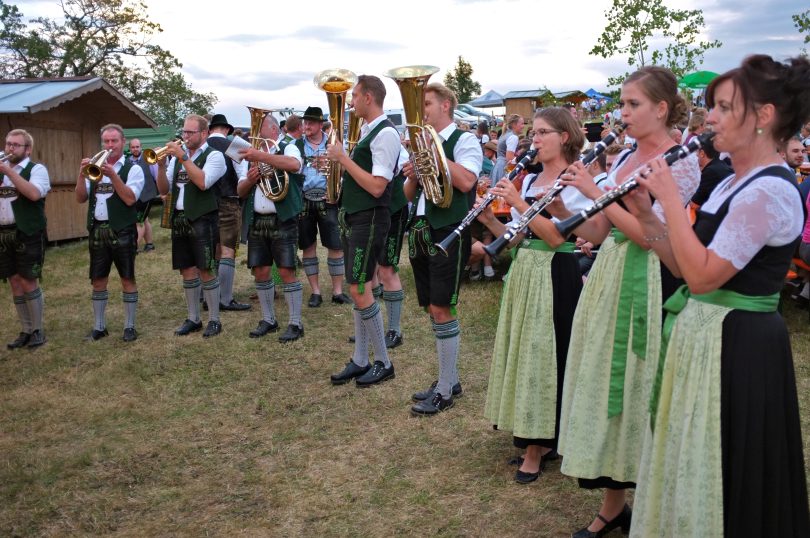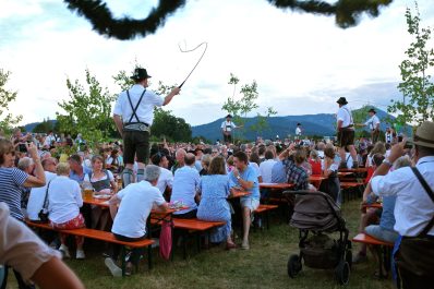 Ein besonderes Jubiläum konnten die Siegsdorfer Trachtler heuer mit ihrem Gartenfest in Reuten feiern. Das Fest auf der großen Wiese im Siegsdorfer Ortsteil Reuten mit dem schönen Blick in die Chiemgauer Berge findet seit 1971 immer am 15. August, dem großem Marien-Feiertag statt und musste, wie so vieles, in den letzten beiden Jahren ausfallen. Heuer konnte nun das runde Jubiläum nachgeholt werden und es kamen wieder viele Hundert Gäste, viele von ihnen treue Stammgäste des Festes, nach Reuten und genossen neben dem schönen Ausblick besonders auch den guten Service der über 80 Helferinnen und Helfer des Trachtenvereins. Diese hatten bereits im Vorfeld aus einer unberührten Wiese einen gemütlichen Festplatz gezaubert und bewirteten aus dem geräumigen Küchenhaus und den Hütten für Kaffee, Kuchen, Radi und Bargetränken ihre Besucher mit regionalen Schmankerln und den Getränken der beiden Siegsdorfer Mineralbrunnen Adelholzener Alpenquellen und Siegsdorfer Petrusquelle. Auch das süffige Bier der Brauerei Schnitzelbaumer aus Traunstein, die ebenfalls seit über 50 Jahren bestens mit den Trachtlern zusammenarbeitet, fand wieder reißenden Absatz. Schmackhaftes Bauernhof-Eis vom Lindlhof in Nußdorf und zwei große Hüpfburgen der Familie Gstatter aus Siegsdorf rundeten das umfassende Angebot ab. Die Musikkapelle Vogling-Siegsdorf sorgte in zwei Schichten für die musikalische Umrahmung des Festes und begleitete die Siegsdorfer Trachtenjugend bei ihren Tänzen und Plattlern, und zum Sonnenuntergang ließen sich auch die Siegsdorfer Goaßlschnalzer hören und sehen. Die gute Stimmung unter den Helferinnen und Helfern sorgte trotz des starken Andranges für einen reibungslosen Ablauf und als zur Dämmerung die Musikanten zum traditionellen „Vergelts Gott – Standerl“ vor die Küche kamen, schlug bei vielen der jüngeren Helferinnen und Helfer der anstrengende Tag in euphorische Feierlaune um, die dann auch gründlich ausgelebt werden durfte.