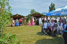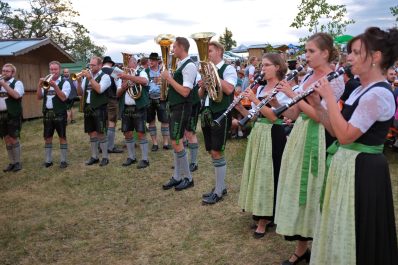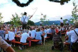 Diese hatten bereits im Vorfeld aus einer unberührten Wiese einen gemütlichen Festplatz gezaubert und bewirteten aus dem geräumigen Küchenhaus und den Hütten für Kaffee, Kuchen, Radi und Bargetränken ihre Besucher mit regionalen Schmankerln und den Getränken der beiden Siegsdorfer Mineralbrunnen Adelholzener Alpenquellen und Siegsdorfer Petrusquelle. Auch das süffige Bier der Brauerei Schnitzelbaumer aus Traunstein, die ebenfalls seit über 50 Jahren bestens mit den Trachtlern zusammenarbeitet, fand wieder reißenden Absatz. Schmackhaftes Bauernhof-Eis vom Lindlhof in Nußdorf und zwei große Hüpfburgen der Familie Gstatter aus Siegsdorf rundeten das umfassende Angebot ab. Die Musikkapelle Vogling-Siegsdorf sorgte in zwei Schichten für die musikalische Umrahmung des Festes und begleitete die Siegsdorfer Trachtenjugend bei ihren Tänzen und Plattlern, und zum Sonnenuntergang ließen sich auch die Siegsdorfer Goaßlschnalzer hören und sehen. Die gute Stimmung unter den Helferinnen und Helfern sorgte trotz des starken Andranges für einen reibungslosen Ablauf und als zur Dämmerung die Musikanten zum traditionellen „Vergelts Gott – Standerl“ vor die Küche kamen, schlug bei vielen der jüngeren Helferinnen und Helfer der anstrengende Tag in euphorische Feierlaune um, die dann auch gründlich ausgelebt werden durfte.