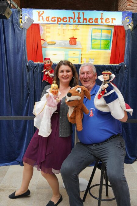 Bildunterschrift: Das Chiemsee Kasperltheater (links im Bild Gastspielerin Maria Reiser, rechts Chiemsee-Kasperl Stephan Mikat) wurde zum 180. Geburtstag von König Ludwig II. ins Schloss Herrenchiemsee eingeladen. Im Herbst 2025 ist das Chiemsee Kasperltheater wird mit der Bayerischen Kasperltour zwischen Freilassing und München unterwegs.