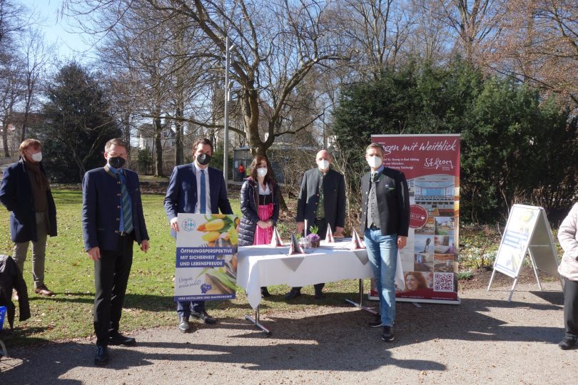 Von der Nordsee bis auf die Zugspitze stellten deutschlandweit Hoteliers und Gastronomen einen gedeckten Tisch bzw. ein gemachtes Bett als stillen Protest auf einen öffentlichen Platz auf, um im Vorfeld der nächsten Bund-Länder-Gespräche am 3. März auf die verzweifelte Situation der Betriebe und die momentane Perspektivlosigkeit hinzuweisen. Auch in der oberbayerischen Kurstadt Bad Aibling wurde die Aktion als Unterstützung der seit November geschlossenen Betriebe durchgeführt. Vor Ort dabei waren auch der Erste Bürgermeister der Stadt Bad Aibling Stephan Schlier, der Referent für Wirtschaft und Tourismus Dr. Thomas Geppert, der zugleich Landesgeschäftsführer des DEHOGA Bayern ist, sowie Bad Aiblings Kurdirektor Thomas Jahn.