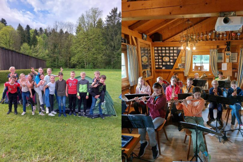 Fotos: Eva-Maria Gruber – Die Jugendblaskapelle Eggstätt beim Proben in der Hufeisenvereins-Hütte sowie auf dem Platz mit der musikalischen Leiterin Eva-Maria Gruber.