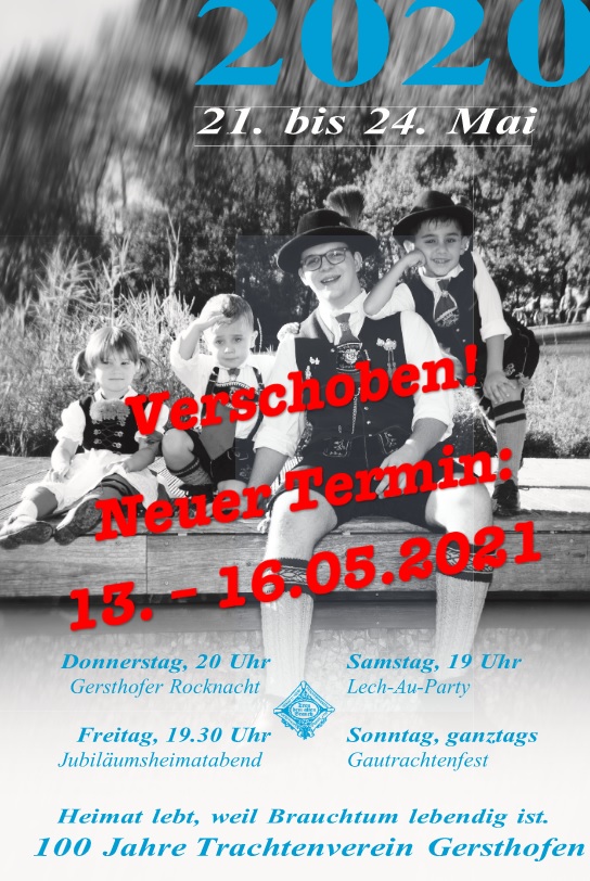 leider können auch wir vom Heimat- und Volkstrachtenverein Gersthofen unser lebendiges Brauchtum gerade nicht öffentlich zeigen. So müssen die Feierlichkeiten zu unserem 100. Geburtstag sowie das Gaufest des Altbayrisch-Schwäbischen Gauverbandes aufs nächste Jahr verschoben werden. Bitte haltet euch hierfür den 13. – 16.05.2021 frei. Aufgrund der Corona-Pandemie sagen wir hiermit ganz offiziell unsere Veranstaltungen vom 21. bis 24. Mai 2020 ab. Voller Zuversicht blicken wir aufs nächste Jahr und freuen uns umso mehr, unseren 101. Geburtstag mit euch feiern zu können. Ganz gemäß nach unserem Vereinsspruch: