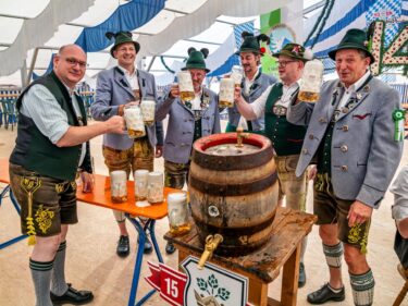 Zum Bieranstich konnten die Hohenaschauer Trachtler die „Kaiser-Musikanten“ aus Österreich gewinnen. Sie spielten das erste Prosit, nachdem Schirmherr und Baron Ludwig von Cramer-Klett im Beisein des Festvereins und des Bürgermeisters das erste Faß Bier von Flötzingerbräu aus Rosenheim mit sechs Schlägen und geringen Bierverlusten anzapfte. Alsdann nahm die gute Stimmung noch zu, hierzu trugen die zehn Musikanten sowie die Dirndl und Buam des Hohenaschauer Vereins mit erfrischenden Auftritten bei. Die Buam präsentierten dabei einen eigens einstudierten Plattler namens „140er“ zu Ehren des 140. Vereinsjubiläums. Das weitere Festprogramm (www.trachtenverein-hohenaschau) sieht am Samstag, 27. Juli den Gauheimatabend, am Sonntag, 28. Juli um 10 Uhr einen Gottesdienst und um 14 Uhr den Festzug vor, diesen unter anderem mit Bayerns Ministerpräsidenten Dr. Markus Söder. Die weiteren Gauveranstaltungen sind am Donnerstag, 1. August das Chiemgauer Tanzfest ab 20 Uhr und am Sonntag, 4. August das Gaupreisplatteln ab 9.30 Uhr.