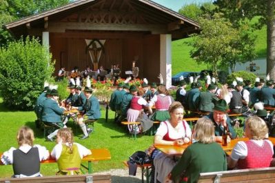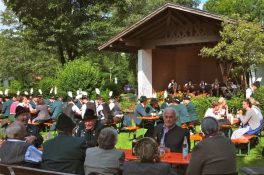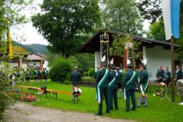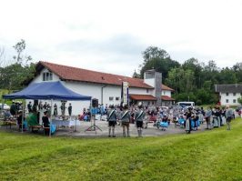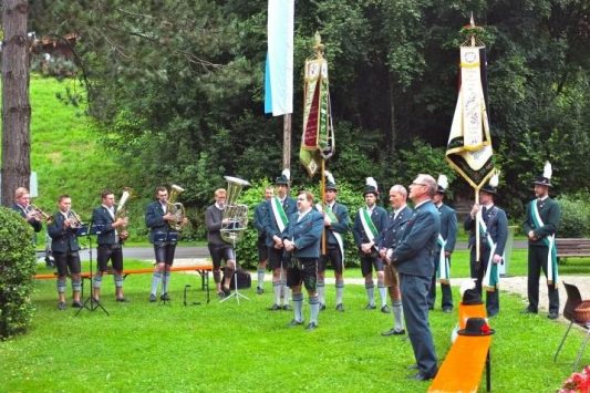 Mit einem feierlichen Gottesdienst und einem kleinen Frühschoppen im Kurpark in Hammer beteiligten sich die vier Trachtenvereine mit ihren Vorständen und den Fahnenabordnungen an der Aktion „Gaufest Dahoam Auch der GTEV „D´Sulzberger Hammer“ schloss sich der Idee an, und nutzte die Aktion, um ein letztes Mal eine Messe vor dem Musikpavillon im Hammerer Kurpark zu feiern. Der Pavillon wird in Kürze abgerissen und durch einen „Kulturstadel“ ersetzt, der den Trachtlern und den Hammerer Ortsvereinen dann als Versammlungs- und Probenraum dienen kann. Vorstand Klaus Gimpl freute sich, dass mit dem Patenverein GTEV Heutau, den „gmüatlichen Hochberglern“ und dem GTEV Siegsdorf fast alle Trachtenvereine der Gemeinde und auch Siegsdorfs 1. Bürgermeister Thomas Kamm und 3. BGM Martin Maier seiner Einladung gefolgt waren, um wenigsten in Gedanken mit dem Nachbarverein Bergen in Verbindung zu sein. Er bat Pfarrer Thomas von Rechberg aber auch um den Segen für die in Kürze beginnenden Bauarbeiten, die bis zum geplanten Jubiläumsfest der FFW Hammer im August nächsten Jahres abgeschlossen sein sollten. Der Geistliche, der die Messe mit Unterstützung von Josef Steinbacher an der Elektroorgel und einer Bläsergruppe zelebrierte, nutzte das nahe Rauschen der Roten Traun um anhand einer Fisch-Geschichte die allumfassende Gegenwart Gottes in unserem Leben zu verdeutlichen. „Respekt, dass ihr auch im Rahmen der eingeschränkten Möglichkeiten euren Weg weitergeht“, lobte Pfarrer von Rechberg die Trachtenvereine der Gemeinde und segnete bei einem Rundgang durch die Parkanlage alle Gottesdienstteilnehmer. Die von einigen Hammerer Buam und ihren Freunden neu gegründete „Viaschupf Tanzlmusi“ spielte dann im Pavillon noch zum gemütlichen Frühschoppen auf, den die Hammerer und ihre Gäste zu einem lange vermissten Ratsch und Gedankenaustausch nutzten, alles natürlich unter dem Blickpunkt der angesagten Abstands- und Hygieneregeln.