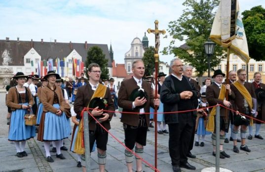 Mit dem Zug ging es nach Heiligenstatt. Die 6,5 km lange, fußläufige Dankwallfahrt führte von der dortigen Wallfahrtskirche nach Altötting. Es war das erste Mal in diesem Jahr, dass Wallfahrer an den Toren von Altötting ankamen. Für Emotionen sorgte der Klang des Wallfahrtsgeläuts, das ebenfalls erstmalig in diesem Jahr zu hören war. Nach dem Segen des neuen Stadtpfarrers Dr. Klaus Metzel, der 55 aktive Trachtlerinnen und Trachtler von Beginn an begleitete, ging es nach einigen Plattlern und Auftritten der Schnalzergruppe zum Wirt nach Gramming.