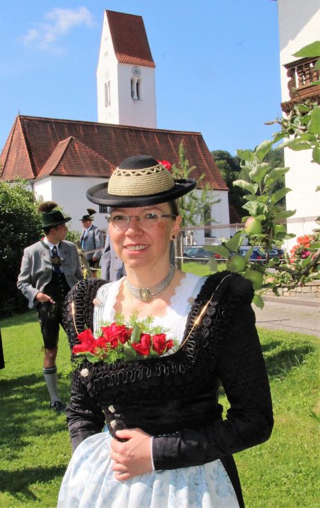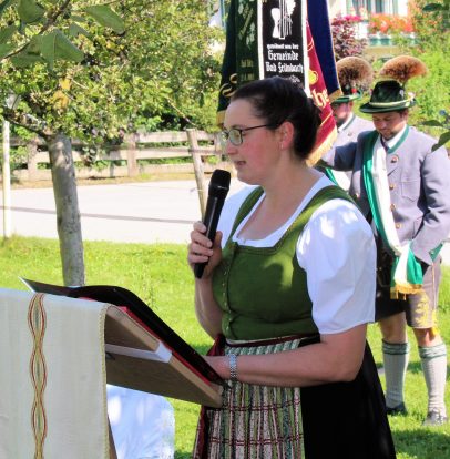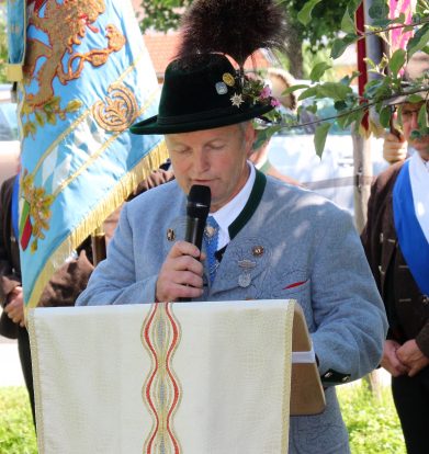 Allerdings unter Bedingungen, hervorgerufen durch Corona-Verordnungen, die vor allem ältere Mitglieder wie etwa Ehrenmitglied Hartl Singer in seiner 66-jährigen Laufbahn als Trachtler noch nie erlebte. Während der Pandemie „Dahoam bleibm“ und sich nicht mit Gleichgesinnte treffen, Abstand und Hygieneregeln einhalten und auf das bunte Platteln und Drehen der Jugend verzichten müssen kannte der 78-jährige Radlmechaniker aus Kematen, der zuverlässig als Festleiter drei Jubiläen verbuchte, bislang nicht. Trachtler halten in schwierigen Situationen zusammen, stellte Uschi Berger (46) als Vereinsschriftführerin und Mitorganisatorin von „Gaufest dahoam“ in Kematen mit Blick auf die bunte Kulisse zu Beginn eines ansprechenden Wortgottesdienstes mit Fahnenabordnungen örtlicher Traditionsvereine am kleinen Altartisch im Obstgarten fest. Für geistliche und meditative Gedanken hatte Barbara Huber passende Worte zur gegenwärtigen Situation im Matthäus-Evangelium gefunden. Auf einem Acker wachse nicht nur die gute Weizensaat, welche der Bauer ausbrachte, sondern auch das Unkraut, das vom Bösen stamme. Beides solle zusammen wachsen. Jedoch solle das Unkraut zuerst geerntet, gebündelt und anschließend ins Feuer geworfen werden.