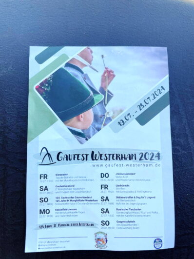 Vom Freitag, 19. Juli (Bieranstich) bis Sonntag, 28. Juli feiern die Trachtler des GTEV “D´Mangfalltaler” Westerham ihr 125jähriges Jubiläum mit dem Gaufest des Gauverbandes I (Sonntag, 21. Juli).