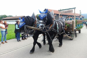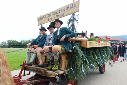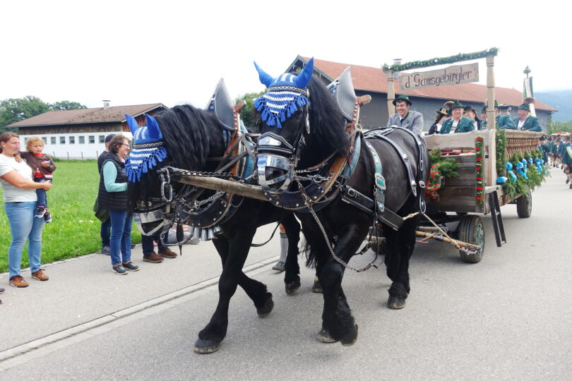 Bereits am Abend zuvor sorgten die Gaujugend- und die Gaugruppe vom Chiemgau-Alpenverband sowie der gastgebende Festverein mit sehenswerten Plattlern und Tänzen für einen Heimatabend voller Freuden, den Musikwart Leonhard Meixner moderierte. Weitere Mitwirkende waren die Festmusikkapelle Übersee-Feldwies, die Feldwieser Goaßlschnalzer, die Frasdorfer Tanzlmusi, der Chiemseewinkl-Dreigesang und das Heiraffe-Duo aus dem Priental. Die Festfreude setzte sich anderntags fort, denn der nächtliche und vormittägliche Regen verzog sich, die Aufstellung zum Festzug erfolgte nicht wie geplant in den übernässten Wiesen, sondern auf den Straßen. Pünktlich um 14 Uhr ging es los. Insgesamt 3.930 Teilnehmer machten sich auf den von vielen dankbaren und interessierten Zuschauern gesäumten Weg durch die Feldwies – Fahnenabordnungen, Musikkapellen, Trachtler in vier Generationen sowie Fest-, Motiv- und Leutewägen trugen zum gelungenen Höhepunkt im Chiemgauer Trachtenjahr bei. Seinen Ausklang fand das Gaufest-Wochenende im Festzelt an den Biertischen, bei Kaffee- und Kuchen im eigenen Bereich, in der Bar oder auch aufgrund der Sonne draußen an den verschiedenen Versorgungsplätzen. Schirmherr Herbert Strauch und Vorständin Marianne Jauernig zeigten sich überglücklich über den enormen Zuspruch und die vielen Ehrengäste, unter anderem auch aus den Reihen der Patengaue Bayerischer Inngau und Altbayerisch-Schwäbischer Gau, vom Nachbarsverband Gauverband I und vom Bayerischen Trachtenverband.