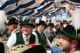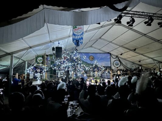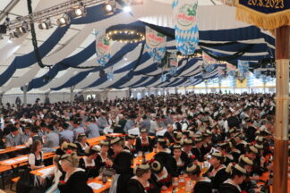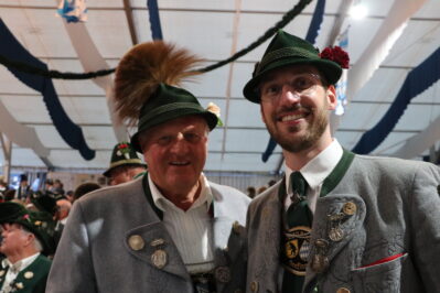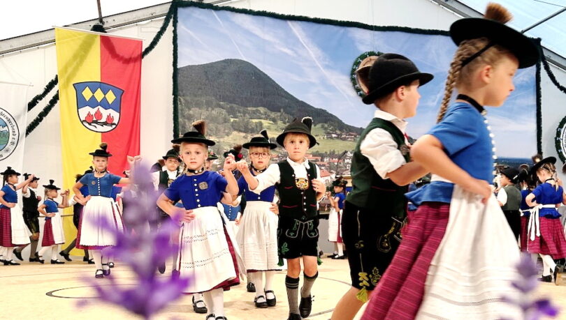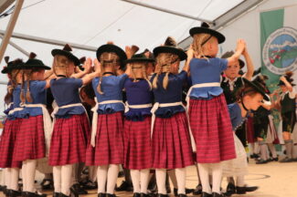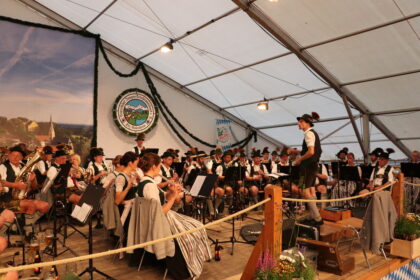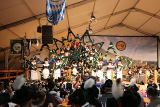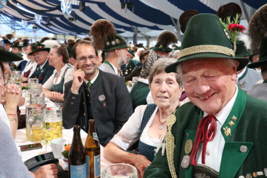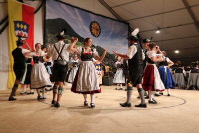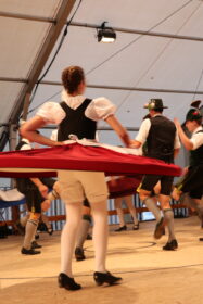 Im Anschluß sang ein Kinderchor, der aus den Plattlergruppen des Vereins besteht, zwei Lieder in baierischer Mundart, bevor der Verein die “Olympia Sternpolka” zeigte. Auch die Gaujugendgruppe zeigte ihr Können mit dem “Innsbrucker” (Plattler) und dem “Gaujugendgruppentanz”. Neben den Goaßlschnalzern des Festvereins spielte ein Bläserensemble auf. Außerdem spielte eine Gruppe aus 16 Ziacherern von jung bis alt zwei Stücke. “Die haben nur ein paar Mal geprobt und können nur zwei Stücke” wurde sie vorgestellt: diese zwei Stücke waren aber trotz der kurzen Probezeit ein echter Genuß! Die beiden Patenvereine der Brannenburger “D’Jenbachtaler” Bad Feilnbach (Gau I) und “D’Kaltentaler” Pang (Inngau) zeigten den “Edelweiß Tanz” bzw. den “Kronentanz” – und freuten sich sichtlich, daß sie bei ihrem Göd auftreten konnten. Natürlich durfte auch die Gaugruppe nicht fehlen: sie zeigten den “Marquardstoana” (Marschplattler),„D’Lahn“ (Plattler) und den “2012er”. Ein Gemeinschaftsplattler und der abschließende “Sterntanz” des Festvereins rundeten das Programm ab. Ein Höhepunkt des “Sterntanzes” war mit Sicherheit, dass die Lichter im Zelt ausgingen – und die Sterntanzbögen zu Leuchten anfingen. Dieser moderne Aspekt des Sterntanzes passte auch gut zu einem Gedicht, daß die Ansager vorgetragen hatten: sie ließen die Künstliche Intelligenz (KI) ein Gedicht über das Platteln verfassen. “Das war jetzt arg leer und wie wenn es von jemand geschrieben wäre, der noch nie in Bayern war” so Sepp Bliemetsrieder und ließ den Vergleich mit einem Gedicht, daß von einem Plattler übers Platteln geschrieben wurde, folgen.