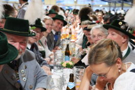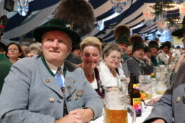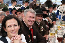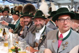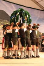 Markus Kronberger nutzte seine kurze Ansprache außerdem, um auf den Festverein zu blicken: nur wenige Monate nach dem 1. Weltkrieg wurde der Verein am 3.3.1920 gegründet. Heute hat er über 500 Mitglieder und damit ein sehr gesundes Fundament. Nach 1931 und 1975 richtet er nun zum dritten Mal das Gaufest des Bayerischen Inngau-Trachtenverbandes aus. “Die Sulzbergler Brannenburg leben die Trachtensache: sie verbinden dabei Gemeinschaft und Gemütlichkeit. Ihr feiert keine Fest für die Zuschauer, sondern fürs Herz” betonte Markus Kronberger und lobte die hervorragende und vertrauensvolle Zusammenarbeit im Vorfeld des Gaufestes. Wie es der Brauch ist, übergab er zusammen mit 1. Gauvorstand Pankraz Perfler als Dank Bierkrügerl an den Brannenburger Bürgermeister Matthias Jokisch, den Festleiter Markus Vogt und den 1. Vorstand Peter Zaggl.