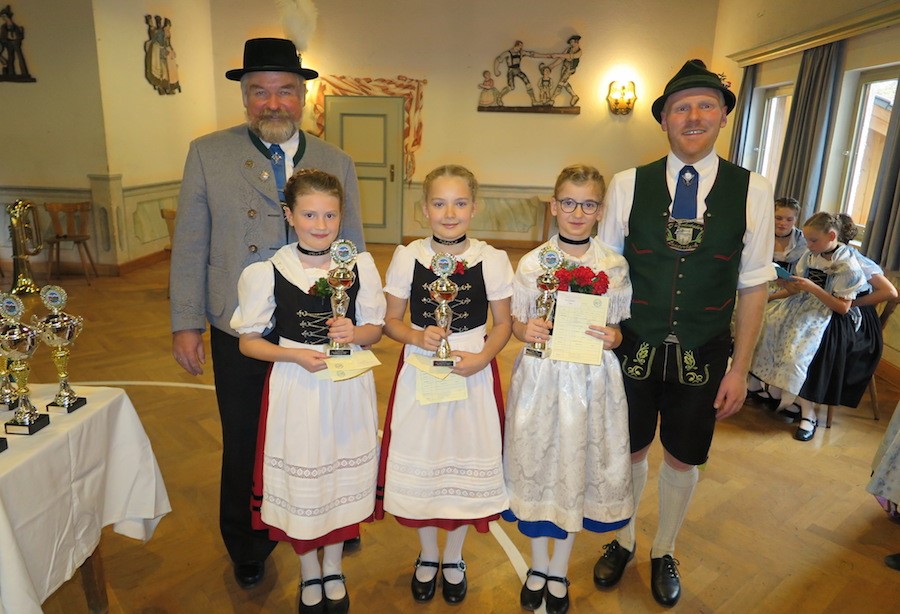 GJDD AK2 von links nach rechts hintere Reihe 1. Gauvorstand Georg Schinnagl, 1. Gauvorplattler Sepp Brem vordere Reihe: Magdalena Niedermaier (Emmering, 2., 142,5 Punkte), Magdalena Lechner (Emmering, 1., 143,3), Bianka Barata (Wittbreut, 3., 142,4)