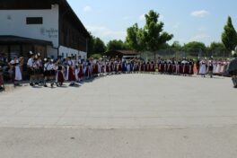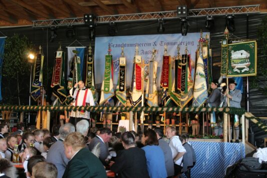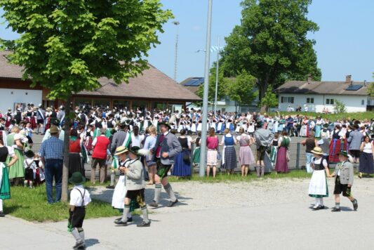 Den Höhepunkt des Gaujugendtages stellte dann der Festzug dar. Angeführt von den Antdorfer Trommlern und der Musikkapelle Habach führte dieser durch die Antdorfer Straßen zum Eisstockplatz am Trachtenheim. Dort formierten sich die Madln und Buam zu einem gemeinsamen Auftanz in 4 Tanzkreisen. Den Zuschauern bot sich dabei ein überwältigendes Bild – 500 Kinder und Jugendliche in ihren jeweiligen Vereinstrachten führten den Auftanz mit Bravour aus. Vergelt´s Gott dabei an die Habacher Musikkapelle für die musikalische Umrahmung dieses über 20-minütige Spektakel. Nach dem anschließenden Rückmarsch zur Festhalle fand die Siegerehrung statt. Den 1. Platz belegte dabei die Jugendgruppe der „Loisachtaler“ Maxkron, die sich über einen „Banzen Spezi“ freuen durften. Aber auch für alle anderen Madln und Buam gab es einen kleinen Preis – ein Erinnerungskrügerl an diesen selten schönen Gaujugendtag in Antdorf.