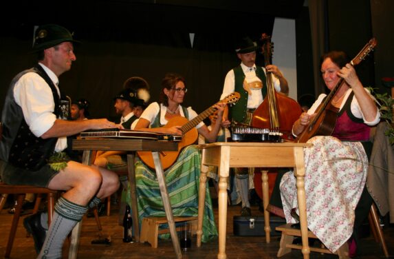 Aus Teisendorf kommt der Familiengesang Hogger mit Elisabeth Hogger sen., Hansi Hogger jun., Elisabeth Hogger jun. und Katharina Hogger. Sie sangen in beeindruckender Klangqualität Volkslieder wie „Do drunt im Stoanagrobn“, „A echter Musikant“ oder passend zur Jahreszeit „Jetzt ziagt der Herbst ins Land“. Ihr letzes Lied „Langsam kimmt Nacht daher“ widmeten sie dem kürzlich verstorbenen Teisendorfer Musikanten, Sänger und Verfechter einer wahren Volksmusikkultur, Sigi Ramstötter in ehrendem Angedenken. Ein Männerviergesang ist etwas Rares, stellte der Moderator fest und freute sich mit den Siegsdorfer Sängern eine Gruppe mit jahrelanger Erfahrung im Vortragen boarischer Lieder für den Abend gewonnen zu haben. Sepp Bertold aus Weildorf, Sigi Brandl aus Traunstein, Hans Ramstötter aus Neukirchen und Hans Mader aus Siegsdorf gehen nach eigener Aussage „als Nachwuchsgruppe nicht mehr durch“, aber Freude macht ihnen das Singen immer noch. Sie überzeugten mit klanglich ausgewogenen Männerstimmen, Jodlern und Akkorden, denen der Saal ergriffen lauschte. Für Lieder wie „s’Dirndl is wunderschee“, „Brautschau“ oder “Is hoid da Suma aus“ bekamen sie viel Applaus.