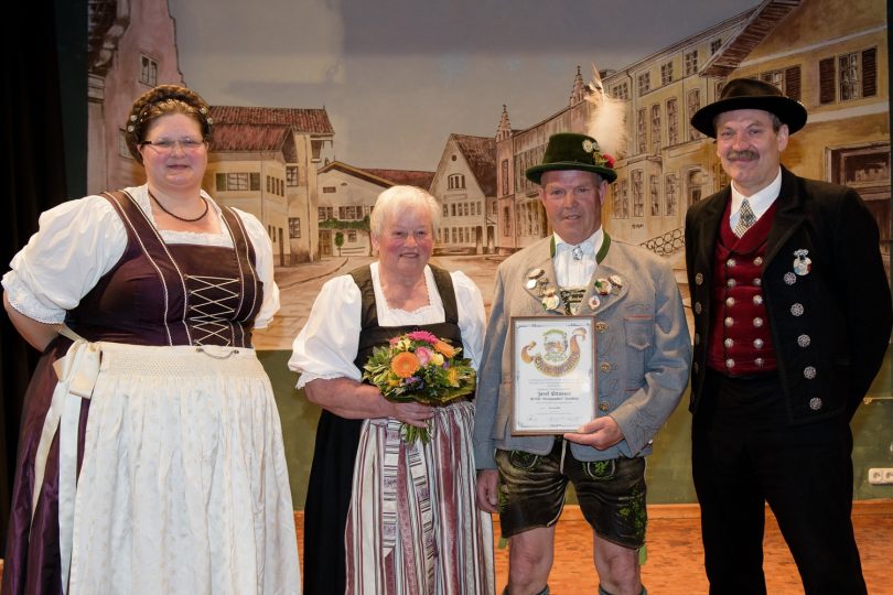 Im Rahmen des Heimatabends wurde dem Ehrenmitglied und ehemaligen Vereinsvorstand Josef Strasser vom Gebietsvertreter Franz Leipfinger für seine Verdienste das goldene Gauehrenzeichen verliehen. Seit seinem Beitritt im Jahre 1970 ist Strasser unentwegt für die Trachtensache tätig und besetzte verschiedenste Positionen im Vereinsausschuss. Bereits im Jahr 1973 wurde auf sein Betreiben die erste Hausmusigruppe gegründet. Von 1974 – 1996, also ganze 18 Jahre lang, übte er das Amt des Musikwartes aus. In dieser Zeit entstanden viele versch. Musikgruppen aus Buam und Dirndl der Vereinsjugend. Im Oktober 1986 übernahm Strasser das Amt des 1. Vorstandes. Die Förderung der Jugend und die Unterstützung bei der Jugendarbeit lagen ihm auch hier sehr am Herzen. Deswegen ist ihm 2007 das goldene Ehrenzeichen der bayrischen Trachtenjugend verliehen worden. Strasser übte das Amt bis zum Jahr 2012 aus, war also 26 Jahre lang der erste Vereinsvorstand. Auch nach Weitergabe seines Amtes an Irene Knott unterstützte er Irene beim Einfinden in ihrer neuen Aufgabe und vertritt diese, insbesondere seit das Amt des zweiten Vereinsvorstandes unbesetzt ist. Im Jahr 2015 wurde Strasser zum Ehrenvorstand ernannt. Auch weiterhin nimmt er an jeder Ausschuss Sitzung als Beisitzer teil.