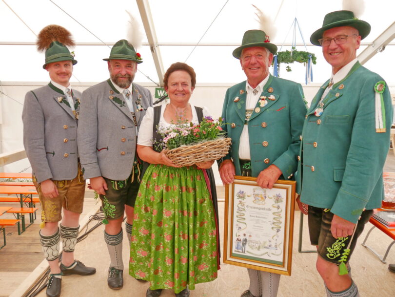 Foto; v.l.n.r.): Flori Niedermaier (stellv. Gauvorstand), Michi Hauser (1. Gauvorstand), Hilde Haberlander (Ehefrau von Hans Haberlander), Hans Haberlander, Fred Gehmacher (stellv. Gauvorstand). Foto: M. Konnert
