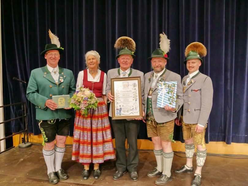 Peter Eicher wurde feierlich zum Gauehrenvorstand ernannt und erhielt die Ehrenplakette des Gauverbandes I – 60 Jahre, 23 davon als 1. Gauvorstand des Gauverbandes I hat sich, Peter Eicher für die Trachtensache eingesetzt und verdient gemacht. Wie in der Laudatio seines Nachfolgers, Michi Hauser zu hören war, ist es vor allem seine beständige Art, seine Verbundenheit zu Heimat, zu den Traditionen und des bayerischen Brauches, die Eicher auszeichnen. Mit vollster Kraft hat er sich für die Jugendarbeit eingesetzt und alle Vorschläge aufgenommen, um gerade die Nachwuchsarbeit zu fördern. Bei vielen persönlichen Kontakten mit Vorständen und Trachtlerinnen und Trachtlern hat er sich stets allen Anliegen angenommen. 22 Gaufeste und unzählige Jubiläumsfeiern der 117 dem Gauverband I angeschlossenen Vereine hat er begleitet. „Lasst und nicht den einfachen, sondern den geraden, den richtigen Weg gehen, damit Bayern Bayern bleibt“. Dieser und weitere Sinnsprüche waren und sind es, die Eicher ausmachen, nach denen er Entscheidungen anstieß und mitgetragen hat. Große Projekte konnten in seiner Amtszeit verwirklicht werden. So der Bau des gaueigenen Stadels oder auch die Erstellung der Chronik, um nur einige Bespiele zu nennen. Beim Bau des Trachtenkulturzentrums in Holzhausen hat Eicher in unzähligen ehrenamtlichen Arbeitsstunden selbst Hand angelegt. Nur drei lebende Personen können die Ehrenplakette des Gauverbandes I tragen: Peter Eicher wurde sie verdientermaßen verliehen. Außerdem wurde er zum Gauehrenvorstand ernannt. Die Gruß- und Dankesworte der Vereine, seiner Weggefährten aus Gauvorstandschaft, den Sachgebieten und die der Gauehrenmitglieder haben wir in einem Buch zusammengefasst. Ein Erinnerungswerk, mit vielen Bildern und Beiträgen ist dabei entstanden. Peter Eicher: ein ganz besonderer Würdenträger heutiger Zeit. „Wir gratulieren und wünschen viel Glück“