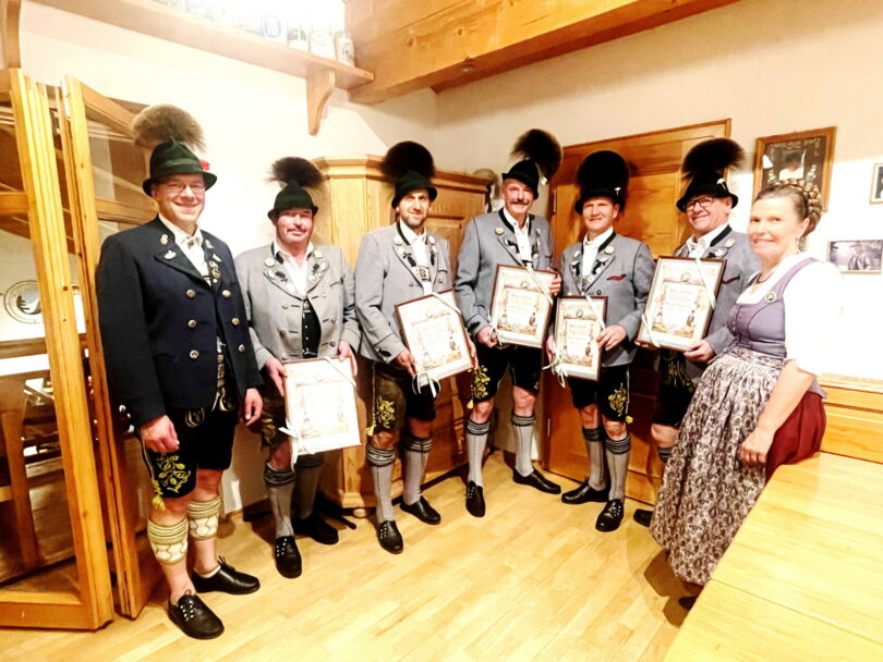 Die rare Form der Ehrenzeichen-Ausführung in Gold bekam Vorstand Paul Kink senior, er ist Trachtler aus Überzeugung und die Tracht ist seine Lebenseinstellung. Wie der Gauvorstand weiter ausführte war er ab 1986 Zweiter und Erster Vorplattler sowie Beisitzer bis 2007. Seit 2008 ist er Erster Vorstand der Niederaschauer Trachtler. Das Gauverdienstzeichen in Silber bekamen Sebastian Schmid senior (seit 1984 stellvertretender Jugendleiter, Erster Jugendleiter, stellvertretender Vorstand und seit 2022 Stadlwart), Peter Reiter (seit 1990 stellvertretender Jugendleiter, Vorplattler und Beisitzer, seit 2008 ist er stellvertretender Vorstand zudem war er von 2003 bis 2009 Erster Gauvorplattler beim Chiemgau-Alpenverband), Rudi Wörndl (18 Jahre Fähnrich und 11 Jahre Beisitzer im Vereinsausschuss) sowie Sepp Thaurer senior (ab 1982 stellvertretender und Erster Jugendleiter, Beisitzer und von 2018 bis 2021 stellvertretender Vorstand). Mit starkem Beifall würdigten die Delegierten aller Vereine des Chiemgau-Alpenverbandes die geehrten Trachtler aus Niederaschau.