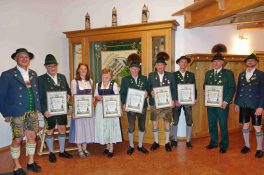 40 Jahre aktives Mitglied bei einem Trachtenverein und aktiver Träger der Tracht zu sein – das ist für den Chiemgau-Alpenverband ein guter Grund, sich mit einer Ehrennadel erkenntlich zu zeigen. Aufgrund von Corona wurden in den letzten Jahren die Auszeichnungen zurückgestellt, so dass es bei der jüngsten Versammlung beim Trachtenverein „Daxenwinkler“ Atzing gleich mehrere Auszeichnungen gab. Unsere Aufnahme zeigt von links: Gauvorstand Miche Huber, Rosi Hötzelsperger, Wilhelm Feichtner, Maresi Dangl, Konrad Huber, Albert Niedermayer und Zweiten Gauvorstand Franz Fischer.#