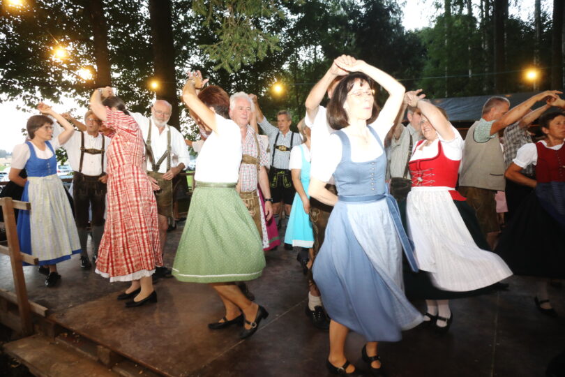 Schon seit inzwischen 35 Jahren stellt der örtliche Volkstanz im Bomaholz beim alljährlichen beliebten Waldfest nicht nur eine feste Größe im kulturellen Veranstaltungskalender dar, sondern gilt darüber hinaus als wahres Schmankerl für Volkstanzbegeisterte. Der Volkstanzabend wird einmal jährlich organisiert. Trotz gleichartiger Veranstaltungen im Umkreis erlebt der Volkstanz im Freien, besser gesagt im Holz nach wie vor einen immensen Zuspruch. Die überaus große Beliebtheit dieser Tanzveranstaltung stellt damit ein regelrechter Höhepunkt für Freunde der Volksmusik und vor allem des bayerisch-traditionellen Volkstanzes dar. Der hervorragende Anklang liegt dabei sicherlich in der stets vorherrschenden angenehm geselligen Stimmung mit viel traditionellen und flotten Volkstanzrunden zu besten bayerischen Klängen begründet. Ein kurzweiliger Volkstanzabend also, auf den sich die Gäste schon lange im Vorfeld freuten und der auch schon lange im Gedächtnis bleiben wird. Neben der Pflege der Förderung und dem Erhalt des Brauchtums “Volkstanz” steht bei dieser Veranstaltung auch ganz klar das zünftige und gesellige Beisammensein bei Tanz und bayerischer Musik im Vordergrund. Nachdem die ersten einstimmenden Musikstücke durch die “De Aichacher Bauernmusi” Lust auf’s Tanzen machten, ging es auch schon tänzerisch und musikalisch so richtig mit dem Auftanz zur Sache. Nach einer kurzen Begrüßung übernahmen die Vortänzer Elisabeth Schuster und Gerhard Böhm wieder die Tanzleitung für den gesamten Tanzabend. Im Jahre 1987 wurde bereits der Wald-Volkstanz unter der Regie des damaligen Vorstands Jakob Mooshofer ins Leben gerufen. Alte wie auch moderne Volkstänze über einfache Rundtänzen bis hin zu anspruchsvollen Figuren- und Wechseltänzen aber auch ausgiebig Boarische, Landler, Walzer, Polka, Dreher und Zwiefache bot dieser Volkstanzabend im Freien. Die Tanzfläche war von Anfang an bis weit nach Mitternacht stehts gut gefüllt. Es war somit ein Tanzabend ganz im Zeichen der Besucher, deren Volkstanzherz dabei auch sicherlich höher schlug.Angefangen vom Boarischa, Bauernmadl, Siebenscritt, Salzburger Dreher, Wenzlpolka, Knedldrahner, Maschierboarischa, über den Böhmerwaldlandler, Rehberger und Niederbairischer Landler, Kreuzpolka und Waldjaga, Sternpolka bis zur Mazurka war alles geboten. Einen wesentlichen Beitrag hatte auch die Musikgruppe “De Aichacher Bauernmusi auf das Gelingen dieser Tanzveranstaltung. Sie boten mit ihrem Repertoire nicht nur Instrumentalmusik, sondern begleiteten diese auch immer wieder mit bayerischem Liedgut. Im Vordergrund des Volkstanzabends stand somit natürlich das Tanzen, aber auch das Zuhören war ein wahrer Genuss.