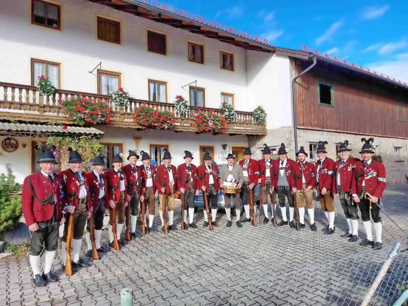 Die Gebirgsschützenkompanie Samerberg konnte ihrem Gründungsmitglied und langjährigem Fähnrich Michael Staber zu seinem 70. Geburtstag gratulieren. Hierzu gab es einen dreifachen Ehrensalut und Hautpmann Fritz Dräxl würdigte in einem kurzen Laudatio die Verdienste vom ” Zenzn Miche” , der seit 1996 die Fahne der Samerberger Gebirgsschützen verwahrt und trägt.