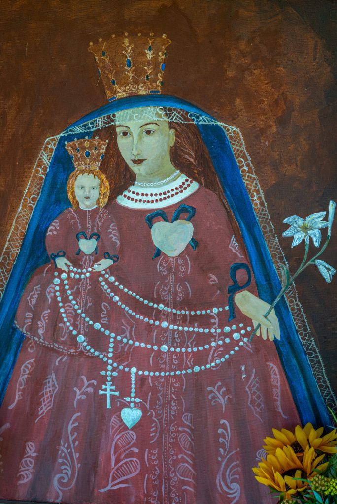Das Altarbild in der Kapelle: Rosenkranzkönigin | Foto: Rainer Nitzsche In Süddeutschland wird Maria als die “Lilie der Täler” verehrt. In der Kunst wird Maria oft mit einer weißen Lilie, der “Madonnen-Lilie”, in der Hand dargestellt. Sie steht in diesem Zusammenhang für die Keuschheit. Die Blume ist Symbol für ewiges Leben.