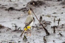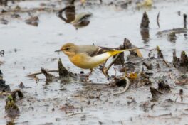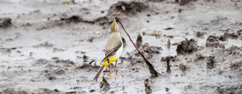 Gebirgsstelze erbeutet im Sprung an Stängeln sitzende Fliegen