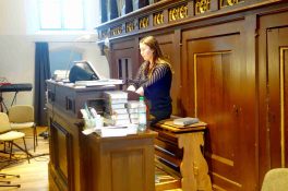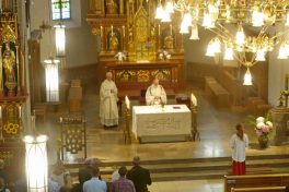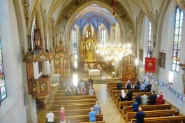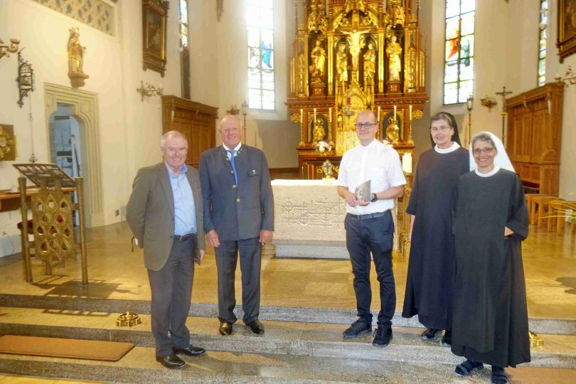 Foto/s: Hötzelsperger – 1. von links: Prof. Dr. Josef Stadler (Neffe von Christine Stadler), Bürgermeister Christian Glas, Pfarrer Andreas Przybylski, Äbtissin Johanna Mayer vom Kloster Frauenchiemsee und Mitschwester Regina. 2. Blick auf Altarraum mit Diakon Josef Stürzer und Pfarrer Andreas Przybylski. 3. Organistin Sarah Rotter 4. Ausstellungsstücke in der Eggstätter Pfarrkirche.