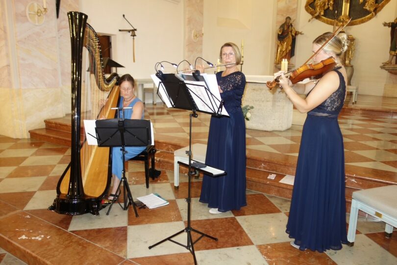 Alexandra Scheufler (Harfe), Corinna Halder (Querflöte) und Luisa-Maria Halder (Geige) ließen ihre Instrumente gefühlvoll mit wunderschöner Musik erklingen. „Ein schöner Tag“ aus dem berühmten „Amazing Graze“ war eine der mit Harmonie dargebotenen Melodien. Eine solche Musik öffne die Herzen und bringe im Inneren etwas zum Klingen, sagte Pastoralreferent Georg Gruber, der verbindende Worte sprach. In seinen Betrachtungen ging er auch auf das Wesen von Träumen ein, die oft aus einer göttlichen Eingebung entspringen würden. Im Traum stehe Gott dem Menschen ganz nahe und durch ihn werde das Leben zur Heilsgeschichte.