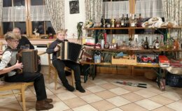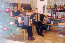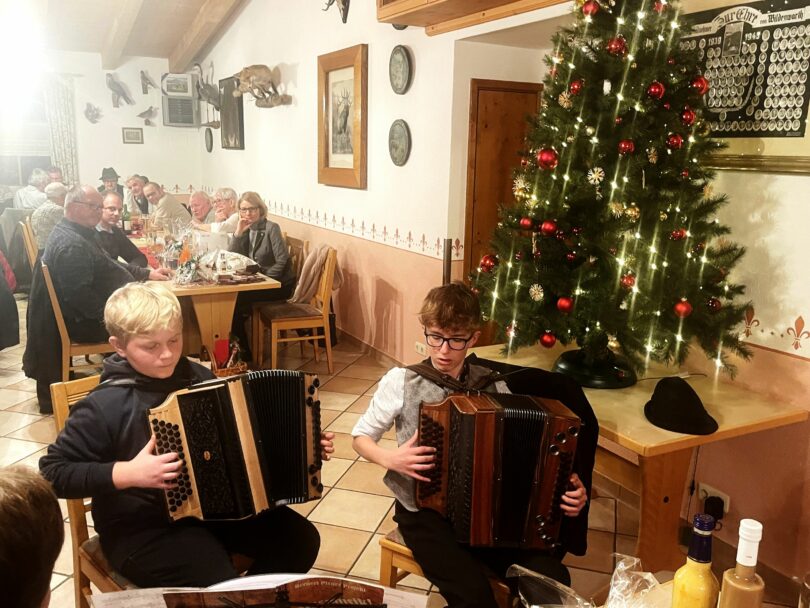 Fotos: Hötzelsperger – Eindrücke von der Christbaum-Versteigerung der Wildenwarter Veteranen in Atzing – 1. Die Brüder Georg und Seppi vom Samerberg mit Ziachweisen – 2. Versteigerer Andi Stoib
