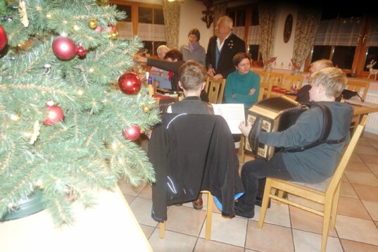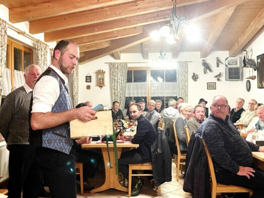 Ergiebiger Schneefall konnte dem Besuchsinteresse für die traditionelle Christbaumversteigerung des Veteranen- und Kriegervereins von Wildenwart nichts anhaben. Im Gasthaus Stocker in Atzing kam nach ersten Ziachweisen der Brüder Georg und Seppi vom Samerberg beste Stimmung und Kaufslaune auf nachdem die Versteigerer Andi Stoib und Matthias Stoib alle Veteranen, Veteraninnen und diverse Veteranen willkommen hießen.