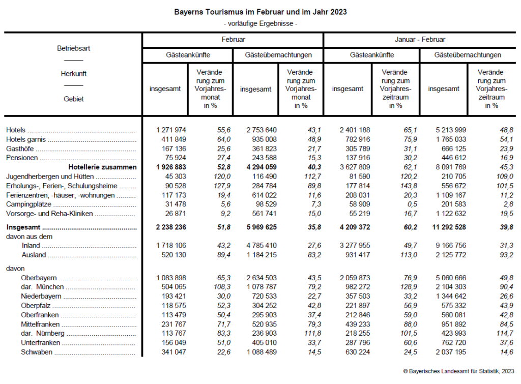 Gelungener Jahresstart für Bayerns Tourismus setzt sich auch im Februar fort Rund 2 Millionen Gästeankünfte und knapp 6 Millionen Übernachtungen im Februar Das Bayerische Landesamt für Statistik meldet im Februar 2023 für die rund 10 700 geöffneten Beherbergungsbetriebe1) Bayerns im Vergleich zum Vorjahresmonat deutlich gestiegene Gästeankünfte und Übernachtungen. Die