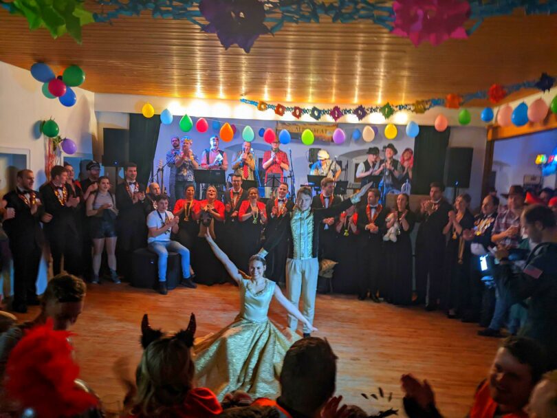 Die Musikgruppe Alpenbeat sorgte dieses Mal für die musikalische Unterhaltung. Eine lustige Einlage zeigten die Aktiven des Vereins. Drei fiktive Personen mussten sich hierbei in drei unterhaltsamen Spielen messen. Dabei wurden zum Teil auch nicht-eingeweihte Personen aus dem Publikum miteinbezogen. Höhepunkt des Abends war kurze Zeit darauf der Auftritt der Aschauer Faschingsgilde, welche zunächst klassisch und später gemäß ihres diesjährigen Mottos “Hände hoch Banküberfall” auftraten. Kurze Irritation und Heiterkeit im Saal gab es vorm Beginn des Auftritts, als sich verkleidete Klimaaktivsten entsprechend ihrer realen Vorbildern an die Tanzfläche “klebten” und so den Start des Auftritts verzögerten.