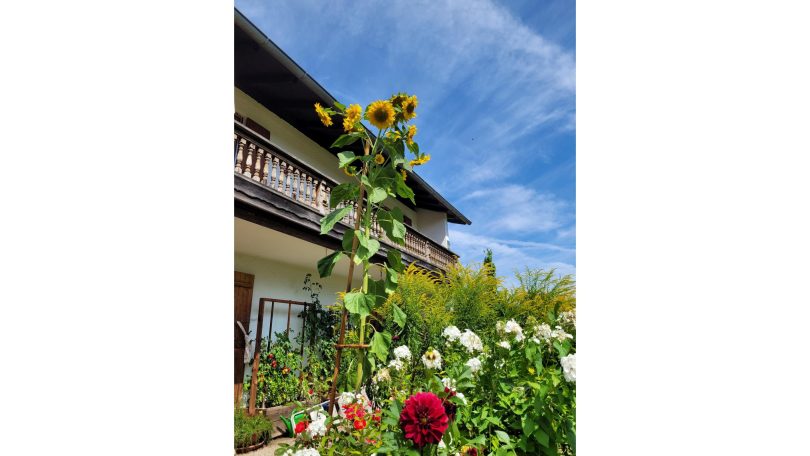 Es war weder Magie noch ein Zauberdünger im Spiel – nur die gute Eggstätter Luft und viel Gießen stecken hinter dem Geheimnis der riesigen Sonnenblume auf dem Hof von Ludwig Wörndl in Eggstätt. Nicht einmal vorgezogen wurde die mittlerweile knapp drei Meter hohe Pflanze, die schon bis zum Balkon reicht. „Die Sonnenblume ging einfach auf. Ihr haben auch die Schnecken nichts anhaben können.“, so Landwirt Wörndl. Um die Sonnenblume vor Wind und Unwetter zu schützen, wird sie sicherheitshalber von einer Stützkonstruktion gehalten. So strahlt sie hoffentlich noch lange weit oben in luftiger Höhe.