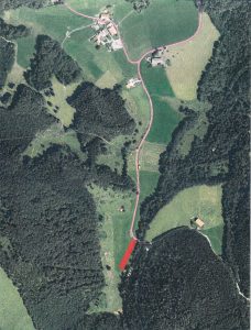 Der neu geplante Wanderparkplatz bei Hintergschwendt (rot gekennzeichnet). Der bereits bestehende und bei den Wanderern bestens bekannte Platz Hintergschwendt/Aigen ist rechts davon im Wald erkennbar, im Norden der Weiler Hintergschwendt. Entlang der schmalen (rosa gekennzeichneten) Straße behindern aktuell falsch abgestellte Fahrzeuge die Einsätze der Rettungsfahrzeuge von Bergwacht und Feuerwehr.