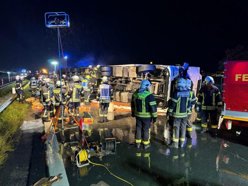 Auf der Autobahn, in Fahrtrichtung Salzburg im Bereich des Bernauer Berg kurz vor der Ausfahrt Bernau stürzte ein LKW aus regennasser Fahrbahn aus ungeklärter Ursache um.