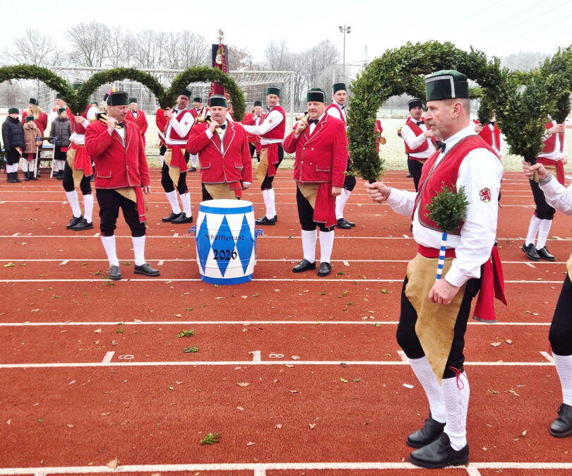 Der Legende nach soll der erste Schäfflertanz nach einer Pestepedemie 1517 in München gewesen sein, wo sich die Schäffler wieder auf die Straßen trauten und mit ihrem Tanz die Leute aus den Häuser lockten. Da die Pest im Sieben-Jahre-Rhythmus ausbrach verfügte Herzog Wilhelm IV, dass der Tanz alle 7 Jahre aufgeführt wird – so der Volksmund. Bereits seit September 2025 proben die Tänzer, Reifenschwinger und Fasslmacher jede Woche, dass der Tanzschritt und die Figurenfolge passen. Einige Marketenderinnen und Kasperl und die Fahnenabordnung machen die Gruppe komplett. Vor kurzen war es soweit, dass die Generalprobe mit der Stadtkapelle Wasserburg im Badriastadion stattfand. Nun kann es losgehen mit dem ersten Auftritt an Heilig-Drei-König um 13 Uhr vorm Wasserburger Rathaus. Diesemfolgen weitere 110 Auftritte in und um Wasserburg bis beim letzten Tanz am Faschingsdienstag der Reifen wieder gebrochen wird.