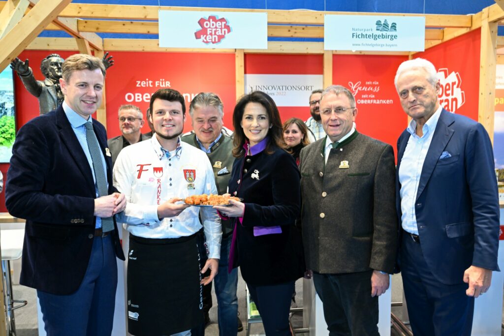 Nach zwei Jahren Coronapause präsentiert sich der Freistaat Bayern in diesem Jahr wieder auf der Internationalen Grünen Woche in Berlin als Land der Genüsse. In der großen Bayernhalle – seit vielen Jahren der Besuchermagnet schlechthin – zeigen über 50 Aussteller den Besucherinnen und Besuchern, was der Süden Deutschlands an kulinarischen Spezialitäten und als gastfreundliche Urlaubsregion zu bieten hat. Bereits zum sechsten Mal präsentiert sich die Ferien- und Genussregion Oberfranken auf der Grünen Woche. Unter dem Motto „Genuss und Tourismus“ werben die Regionen Fichtelgebirge, Frankenwald und Fränkische Schweiz bei den Berlinerinnen und Berlinern für einen Urlaub im schönen Oberfranken. Auch Agrarministerin Michaela Kaniber zeigte sich bei ihrem Rundgang durch die Bayernhalle beeindruckt von den vielfältigen Angeboten und probierte mit einer oberfränkischen Rindfleischwurst auch eine typische Spezialität.