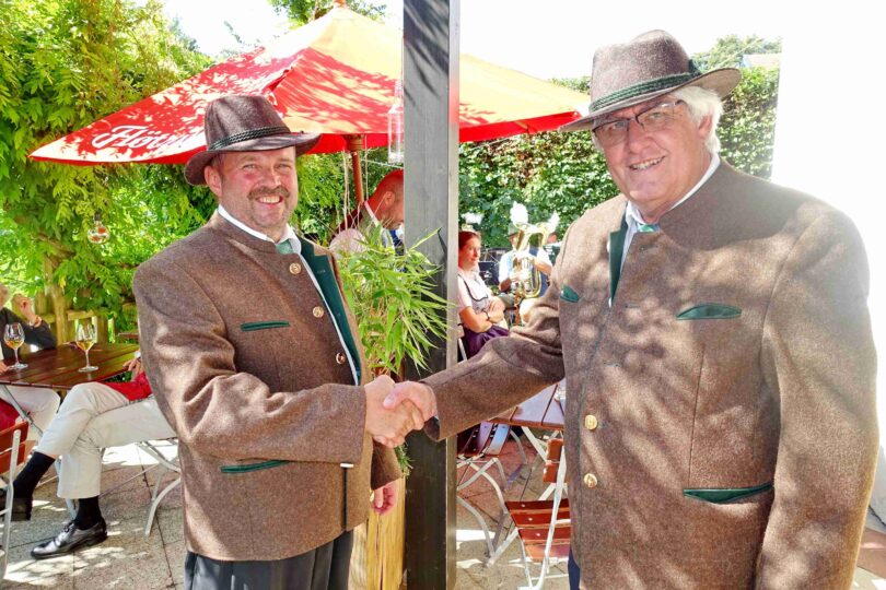 Ein fester Termin beim Krieger- und Soldatenverein Hittenkirchen ist der traditionelle Jahrtag mit Versammlung. Hierzu konnte Vorstand Franz Maurer nach dem Gottesdienst mit Pfarradministrator Gottfried Grengel in der Ortskirche „St. Bartholomäus“ und nach dem Gedenken an der Gedächtniskapelle neben den Vereinsmitgliedern auch die Priener Blaskapelle im sommerlichen Biergarten des Landgasthauses Bufler willkommen heißen. Ein ganz besonderer Willkommsgruß galt seinem Vorgänger Georg Hinterholzer.