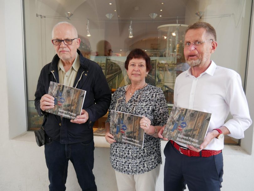 Gerhard Prokop (links) präsentiert seinen Werkkatalog „Stadtlandschaften“, der im Laden des Städtischen Museums Rosenheim im Mittertor erhältlich ist. Das Vorwort schrieb Dr. Evelyn Frick (Mitte), Museumsleiter Walter Leicht (rechts) gestaltete das Schaufenster passend zum Buch.