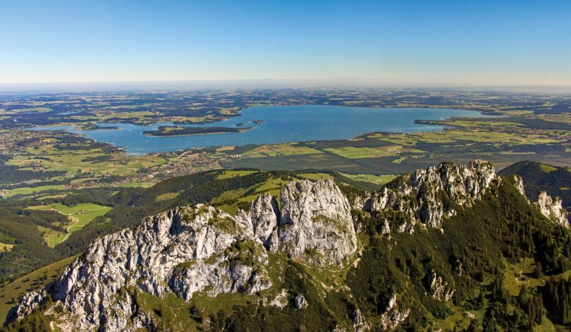 Die Kampenwand aus der Vogelperspektive. Dahinter der Chiemsee in seiner vollen Größe mit den drei Chiemseeinseln Herren-, Frauen- und Krautinsel. Dieses Bild finden Sie mit vielen weiteren tollen Fotoaufnahmen im Chiemgau/Chiemseekalender 2022. Der Doppelkalender erscheint seit vielen Jahren im Chiemgauer Verlagshaus und kann unter folgendem Link angeschaut und bestellt werden: