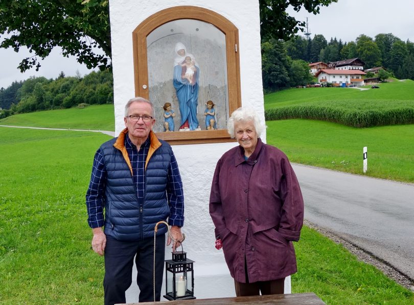 Das „Weiße Marterl“– wie Rosa Bohrer erinnerte – geht zurück auf eine tragische Begebenheit vor über 200 Jahren. Nach mündlichen Überlieferungen wurde es im ausgehenden 18. Jahrhundert von der Herrschaft des Schlosses Wildenwart als Sühnedenkmal für den Mord an einen Schmiedegesellen aus Wildenwart am sogenannten alten Dreiweg zwischen Wildenwart, Prutdorf und Brandenberg errichtet. Der Schmiedegesell soll erschlagen worden sein. Ihm zum Gedenken wurde das heute unter Denkmalschutz stehende Marterl erbaut. Als an der ursprünglichen Marterl-Stelle der Wildenwarter Kreisel errichtet wurde, zog das Marterl einige Meter weiter. Es bekam an der Straße Richtung Röselsberg und Brandenberg erneut einen Platz auf einem Grund der Schmied-Familie, die auch fortan in guter und alter Tradition die Betreuung übernimmt. Als die Umsetzung im Jahr 2005 notwendig wurde, spendierte Herzogin Elisabeth eine Linde, die hinter dem Marterl gepflanzt wurde. Nun kam aber das kostbare Bauwerk in die Jahre und die Schmid-Familie organisierte eine Restaurierungsaktion. Erste Anlaufstelle war Ehren-Oberleutnant Paul Panzer von der Priener Gebirgsschützen-Kompanie. Panzer hat schon viele Restaurierungen im Ehrenamt bei sakralen Objekten und Bauten vorgenommen und stellte sich auch für das Wildenwarter Marterl wieder zur Verfügung. Seine Aufgabe war es, die von einer nicht genannt werden wollenden Frau zur Verfügung gestellte Mutter Gottes sowie die vom Wildenwarter Mesner Georg Kronast gespendeten Engels-Figuren farblich aufzufrischen und dem gesamten Marterl einen neuen Außenanstrich zu geben. Unterstützt wurde das Vorhaben der Bohrer-Familie auch vom Priener Glasermeister Sepp Stöttner, der für ein Sicherheits-Plexi-Glas sorgte und dieses für das gute Werk stiftete. „Ein kleines Bankerl vor dem Marterl soll zum Niedersitzen und Innehalten einladen, denn der Platz vom Marterl bietet viele schöne Ausblicke hinüber zur nahen Kirche Christkönig-Wildenwart und in die Chiemgauer Bergwelt“ – so das Anliegen von Rosa Bohrer, die sich mit ihrer Familie über die erfahrene Unterstützung „ihres“ Marterls sichtlich freute.