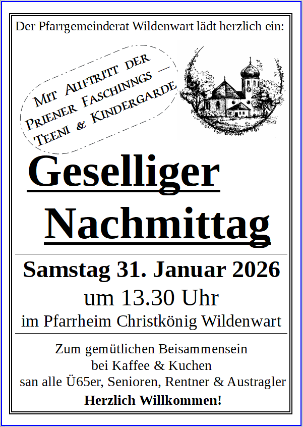 Der Pfarrgemeinderat von Wildenwart lädt für Samstag, 31. Januar zu einem geselligen Nachmittag in das Pfarrheim “Christkönig” ein.