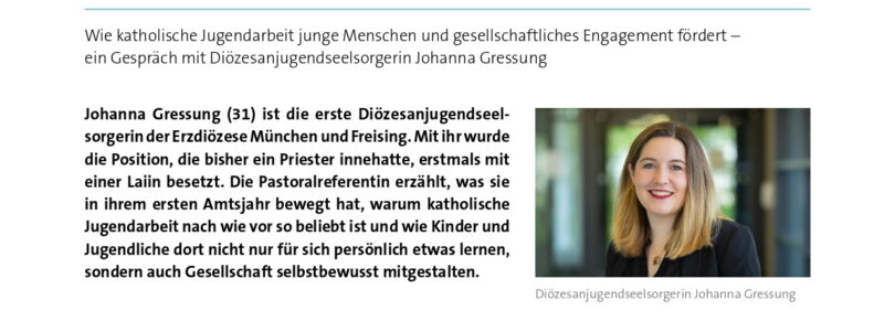 Johanna Gressung (31) ist die erste Diözesanjugendseelsorgerin der Erzdiözese München-Freising. Diese Stelle wurde erstmals nicht von einem Priester, sondern von einer Laiin besetzt.