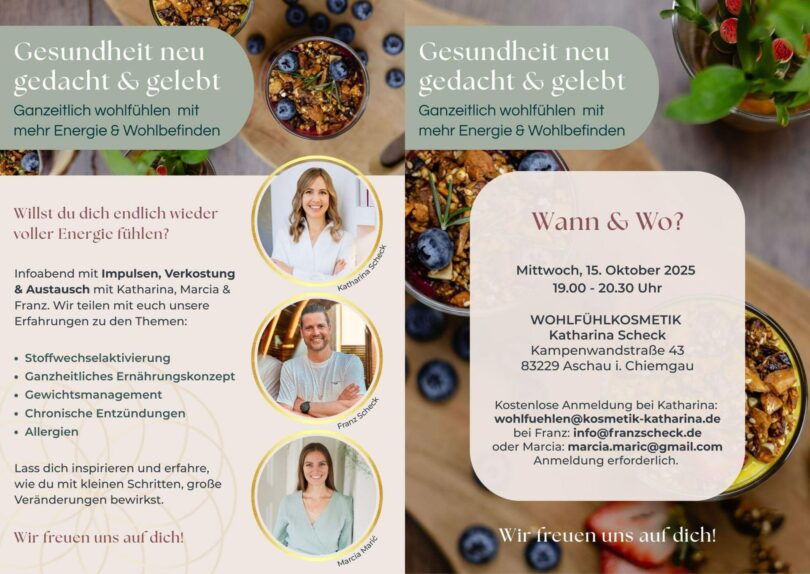 Am Mittwoch, den 15. Oktober 2025, lädt WOHLFÜHLKOSMETIK Katharina Scheck zu einem besonderen Infoabend rund um ganzheitliches Wohlbefinden ein. Von 19:00 bis 20:30 Uhr erwartet die Teilnehmerinnen und Teilnehmer ein abwechslungsreiches Programm mit Impulsen, Verkostung und Austausch.