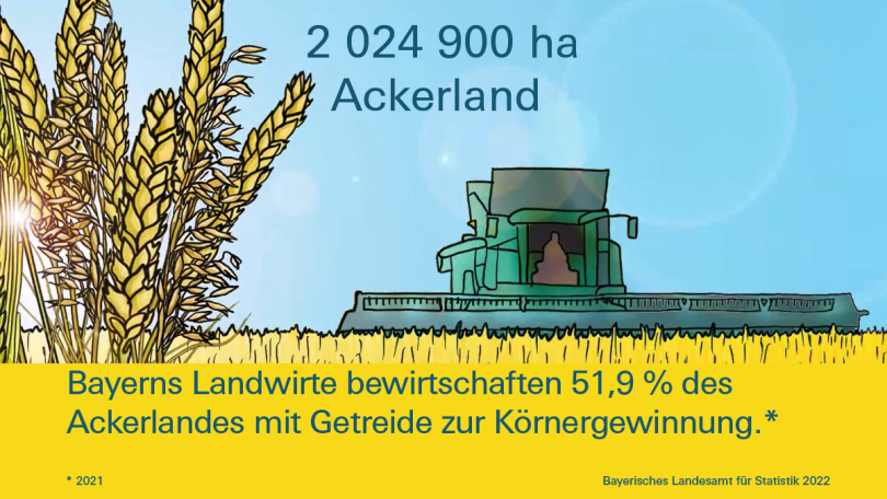 Bayerns Landwirte bewirtschaften mit 51,9 Prozent weiterhin über die Hälfte des Ackerlandes mit Getreide zur Körnergewinnung einschließlich Körnermais und Corn-Cob-Mix (CCM). Die hierfür genutzte Fläche sinkt im Vergleich zum Vorjahr um 8.100 Hektar auf 1.050.300 Hektar.