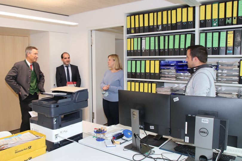 Die ersten Mitarbeiterinnen und Mitarbeiter des Rosenheimer Landratsamtes haben den Umzug in das sanierte Verwaltungsgebäude in der Wittelsbacherstraße 55 in Rosenheim schon hinter sich. Beim Antrittsbesuch von Landrat Otto Lederer (links) im Sachgebiet Wasserrecht gab es viel Lob für die neuen Büros. Abteilungsleiter Dr. Rasso Ludwig und Sachgebietsleiterin Claudia Schweinöster stellten dem Landrat alle Mitarbeiterinnen und Mitarbeiter vor, darunter auch Florian Huber (rechts), der für Anlagen zum Umgang mit wassergefährdenden Stoffen zuständig ist.