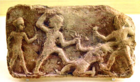 Rechts: Gilgamesch und Enkidu, sein Freund und Beschützer kämpfen gegen einen übermächtigen Dämonen. Links: Es beschützt sie – möglicherweise- der Sonnengott.