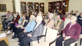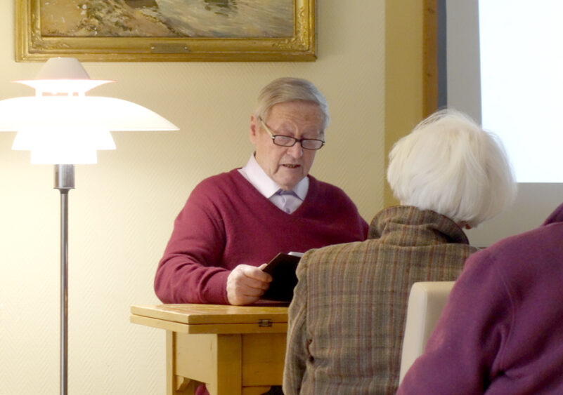 Fotos: Helga Stampfl – 1. Eindrücke von der Senioren-Zusammenkunft im Clubraum der Kursana Residenz – 2. Zwei Hautpakteure: Dr. Herbert Reuther bedankt sich mit Blumen bei Sepp Obermüller (li.)