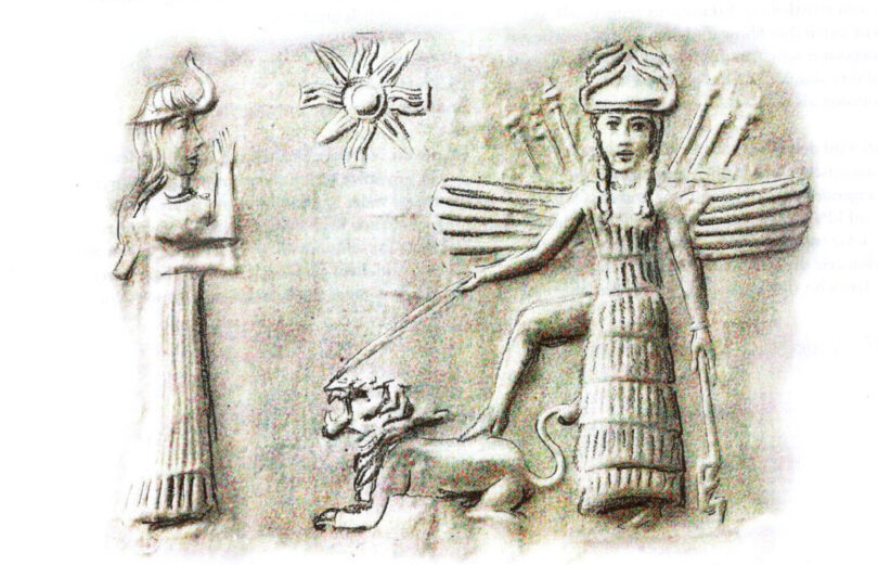 Rechts: Ischtar (Mama) durch den Stern der Göttin determiniert. Links: Evtl. Gilgamesch, der mit der für die damalige Zeit – vor ca. 4.000 Jahren – typischen Gebetshaltung – Hand vor dem Mund, damit kein unreines Wort zur Gottheit gelangen kann – zu Göttin spricht.