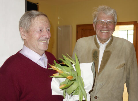 Fotos:  Helga Stampfl –  1.  Eindrücke von der Senioren-Zusammenkunft im Clubraum der Kursana Residenz – 2. Zwei Hautpakteure: Dr. Herbert Reuther bedankt sich mit Blumen bei Sepp Obermüller (li.)